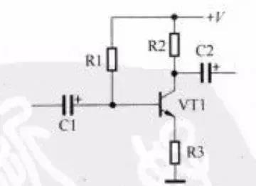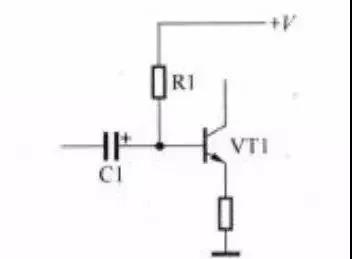 - T1基極上的元器件有三個方向:電源方向、地線方向、前級電路方向。下圖所示是電源+V方向的R1,地線方向上大多有電阻,前級方向上大多有耦合電容。
