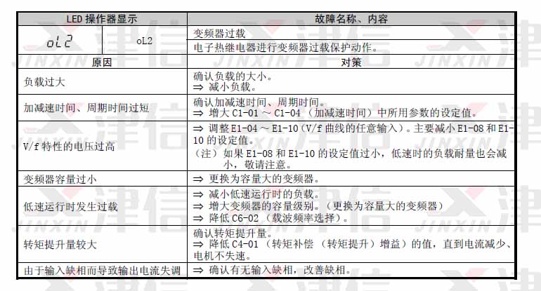 1. 自由運行中或急減速后,電機中還殘留有感應電壓又重啟運行 2. 變頻器發生硬件故障 |